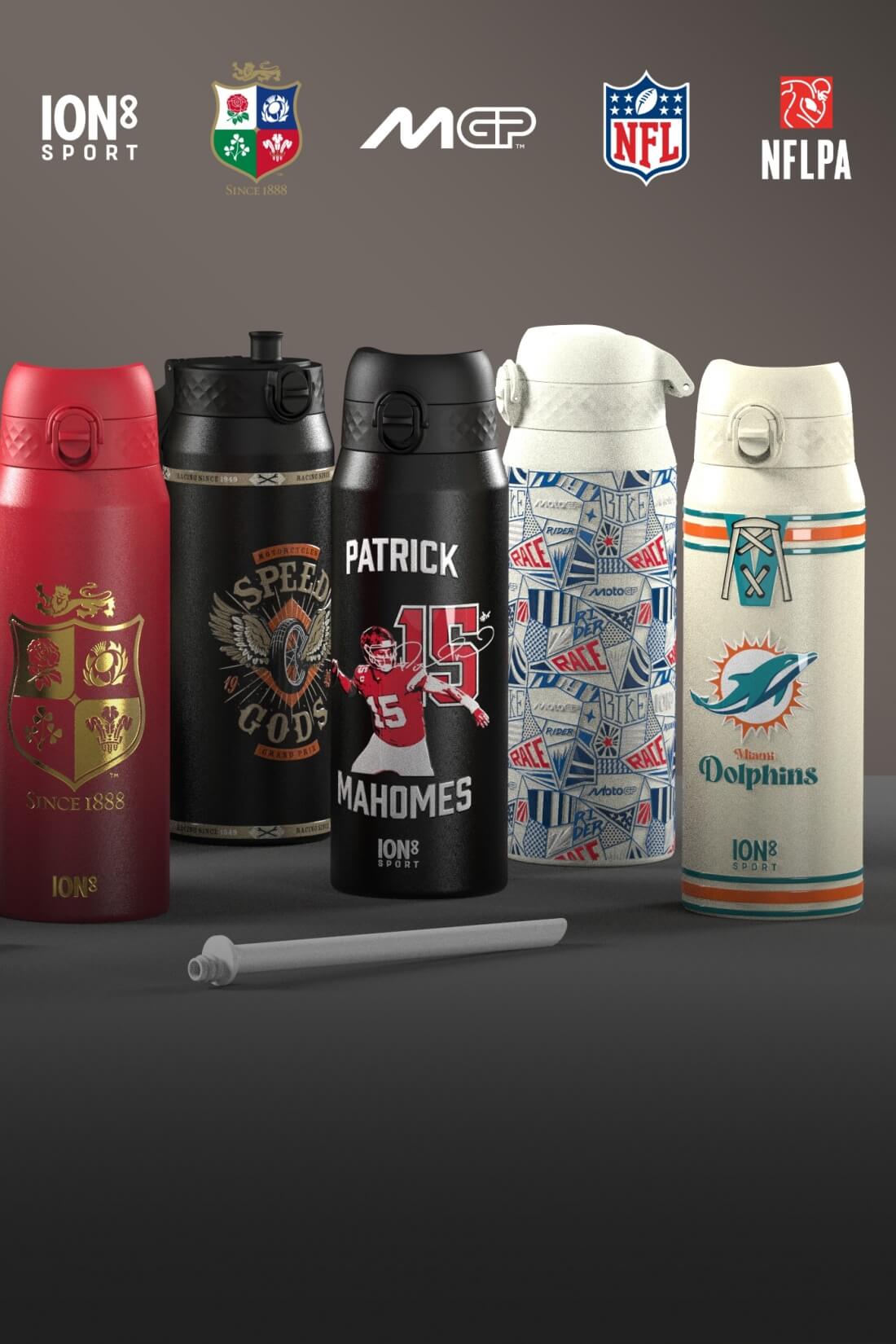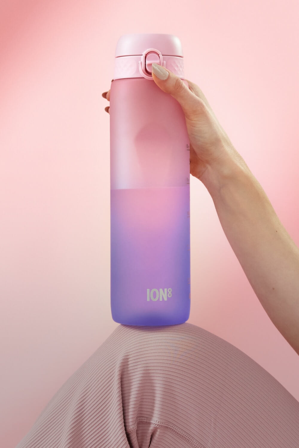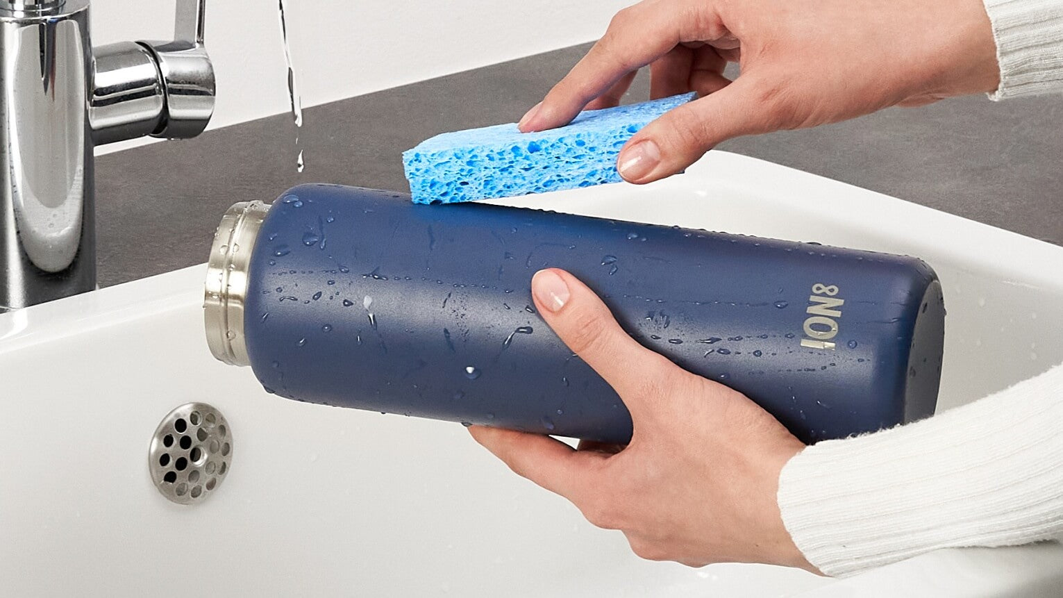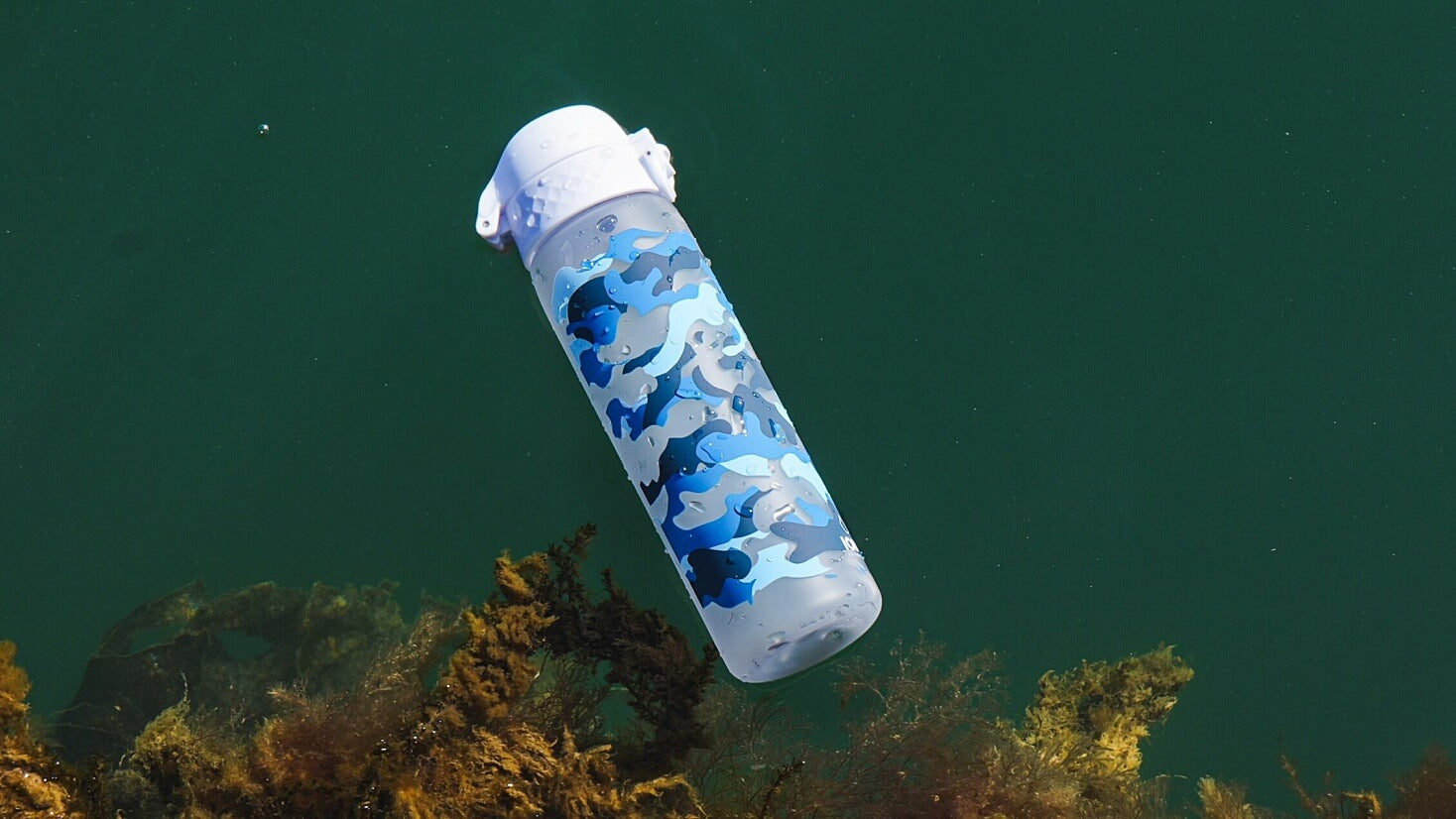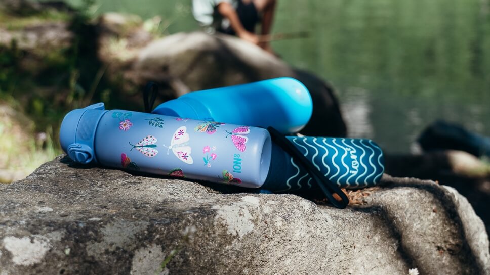 Wähle zwischen Recyclon – einem lebensmittelechten Kunststoff mit 15 % biobasiertem Material – oder Flaschen aus Edelstahl.