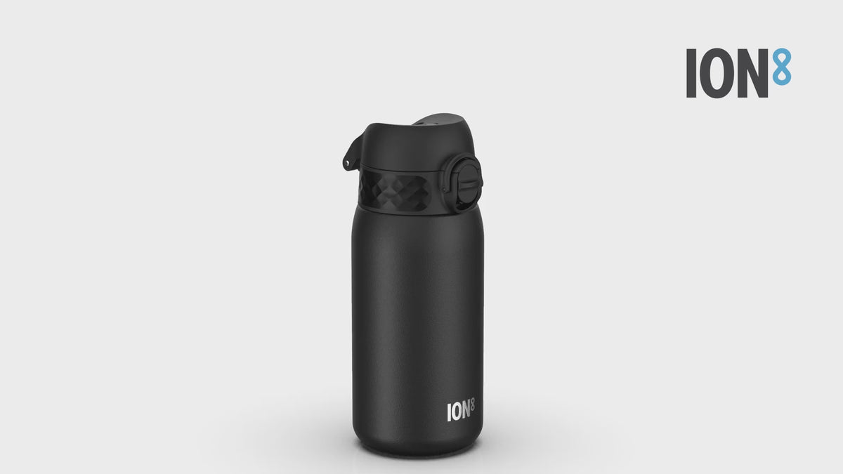 100 % auslaufsichere 320 ml / 11 oz vakuumisolierte doppelwandige schwarze Edelstahl-Wasserflasche mit gleichmäßigem Durchfluss für tropffreies Trinken und hygienischem Voll-Klappdeckel für einhändige Nutzung unterwegs. Hält heiße Getränke heiß und kalte Getränke eiskalt und frisch über Stunden.