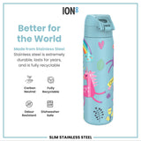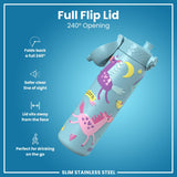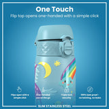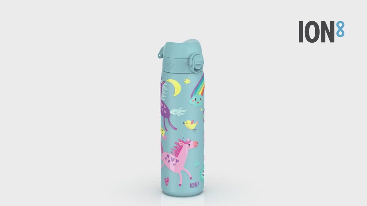 100 % auslaufsichere 600 ml / 20 oz Edelstahl-Wasserflasche mit Einhorn-Motiv, gleichmäßigem Trinkfluss für tropffreie Hydration und hygienischem Klappdeckel für die Einhandbedienung unterwegs.
