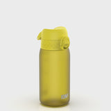 100 % auslaufsichere 400 ml / 13 oz BPA-freie gelbe Sport-Wasserflasche mit gleichmäßigem Durchfluss für tropffreies Trinken und hygienischem Voll-Klappdeckel für einhändige Nutzung unterwegs.