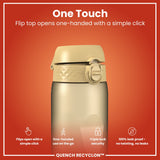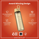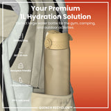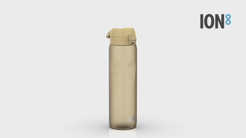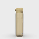 100 % auslaufsichere 1100 ml / 36 oz BPA-freie Sportwasserflasche in Sandfarbe mit gleichmäßigem Trinkfluss für tropffreie Hydration und hygienischem Flip-Top-Deckel für Einhandbedienung unterwegs.