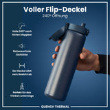 100 % auslaufsichere, fast 1 Liter (920 ml / 30 oz) vakuumisolierte doppelwandige Edelstahlflasche mit gleichmäßigem Trinkfluss für tropffreie Erfrischung und einem hygienischen, vollständig aufklappbaren Deckel für die Einhandbedienung unterwegs. Hält Heißgetränke heiß und Kaltgetränke eiskalt und frisch über Stunden.