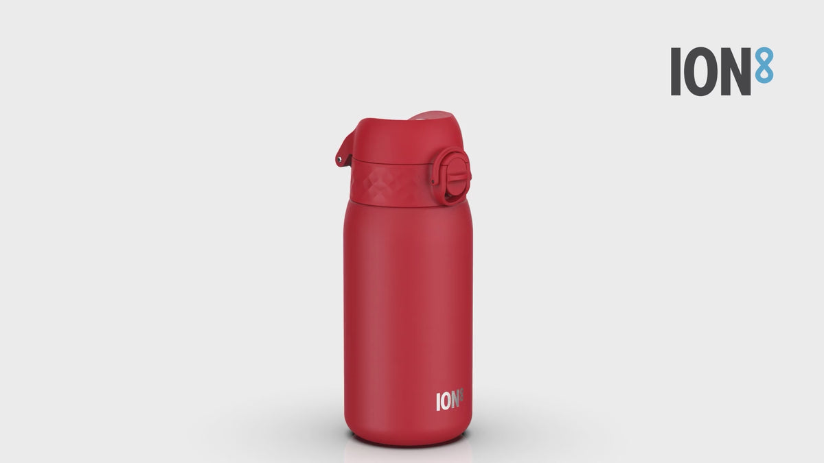100 % auslaufsichere 400 ml / 13 oz rote Edelstahlflasche mit gleichmäßigem Trinkfluss für kleckerfreies Trinken und einem hygienischen, vollständig aufklappbaren Deckel für einhändige Nutzung unterwegs.
